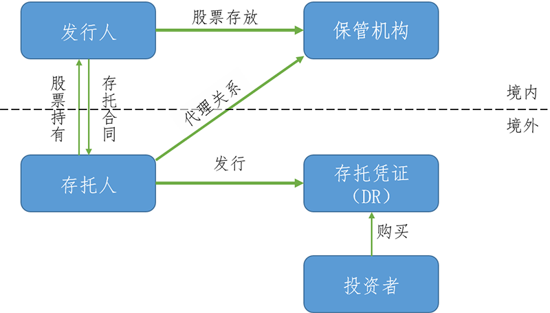 存托凭证(Depository Receipts,简称DR),又称存券收据或存股证,是基于信托制度演变成的一种投资工具,最初被设计出来的目的是为了使投资者更便捷的投资境外公司股票。存托凭证产生的过程是:A国某公司(发行人)为使其股票在B国流通交易,将一定数额的股票委托某一中间机构(通常为银行,称为保管人)保管。同时,根据这家公司和境外某金融机构(存托人)签署的存托合同,存托人成为这一部分股票的名义持有人,也是公司的名义股东。之后,存托人在B国发行代表该股份的存托凭证。这一过程也被称之为存托凭证的“生成”过程。存托凭证“生成”过程中,几方关系如下图所示: