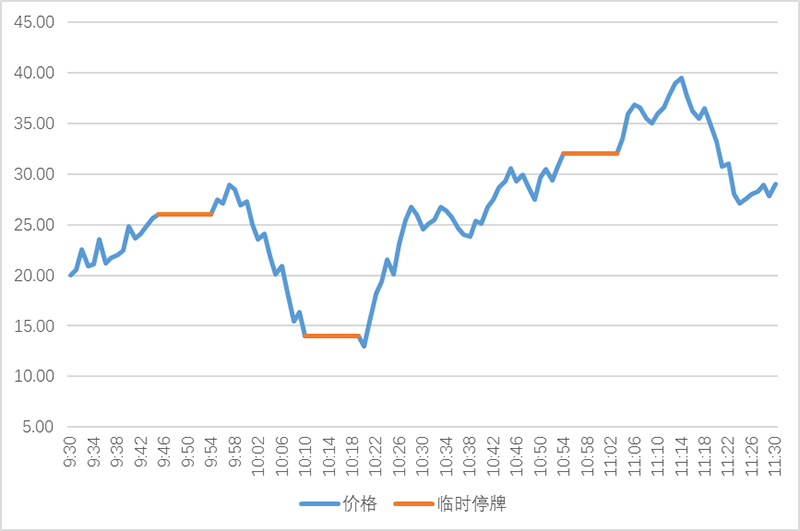 通过下述案例假想的几种情形,简单说明一下临时停牌机制触发过程。科创板新上市股票C,发行价为15元。开盘时股票C的价格已经上涨至20元。新股上市前五个交易日中不设置涨跌幅限制,开盘后很快C的股价上涨至26元,较开盘价上涨30%,触发临时停牌。如下图中所示,橘色线段表示临时停牌阶段。